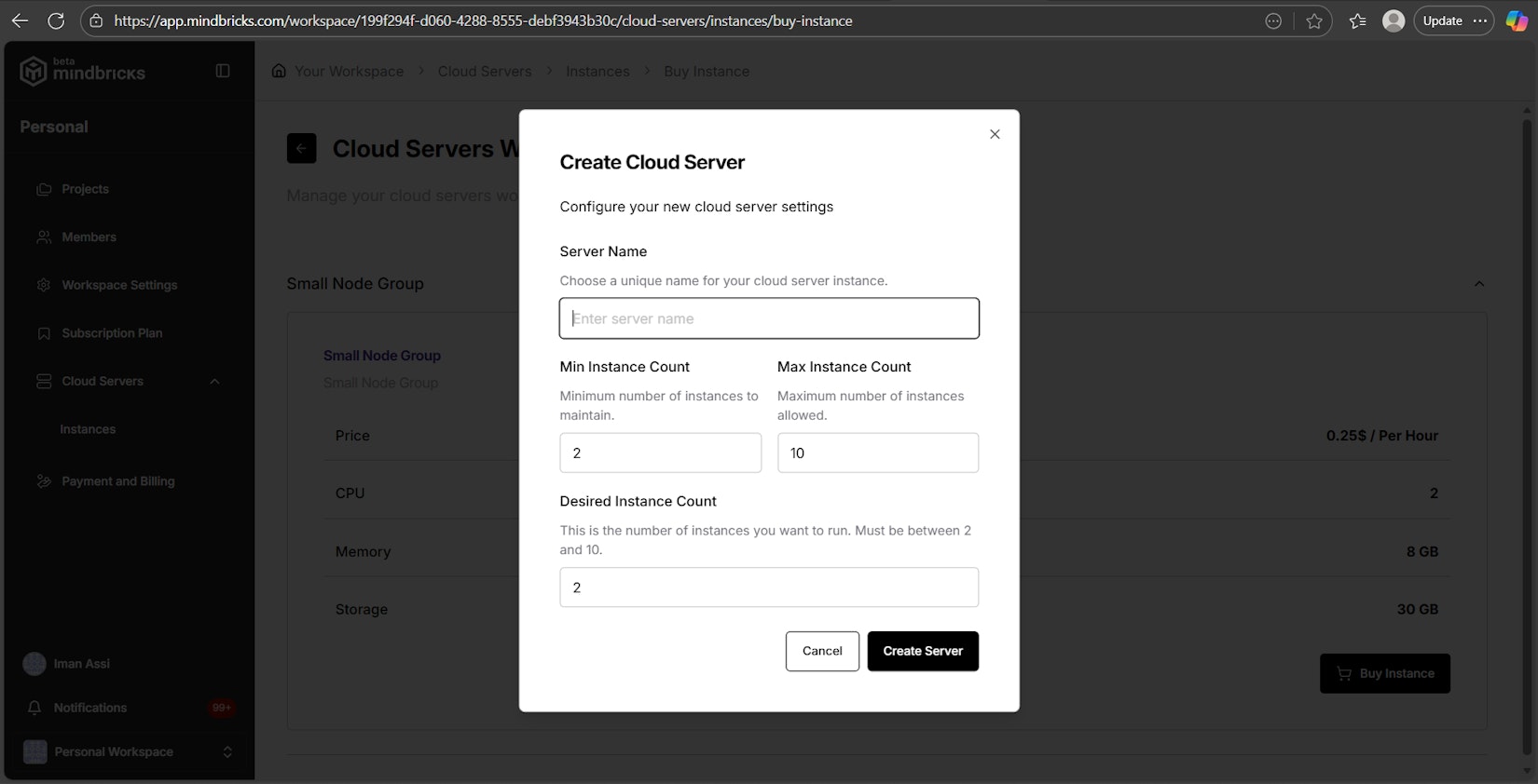 After clicking Buy Instance, a configuration modal opens where you define how the server will run.