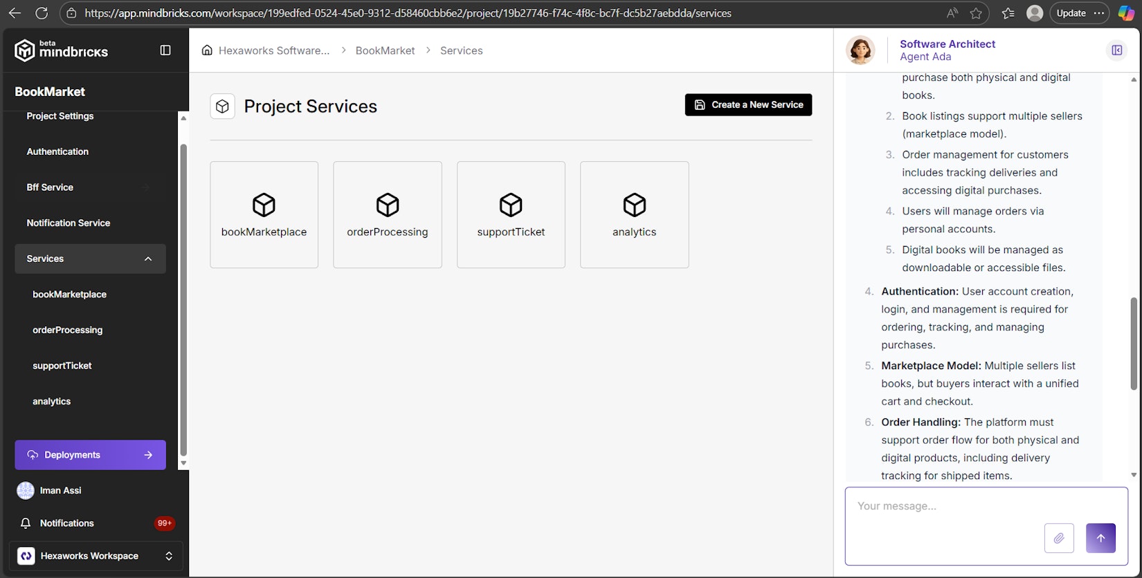 | Services → Main | MindbricksProject.services[] overview (create/delete Service entries). |